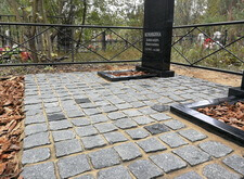 После создания основания мы покрыли территорию места захоронения гранитной брусчаткой, параллельно с этим установив заранее изготовленные памятники и цветники. Затем вернули на место металлическое ограждение и засыпали цветники и площадь перед брусчаткой корой. Этап работ на снимках не отображён, однако на приведённых ниже фото отлично виден итоговый результат.
