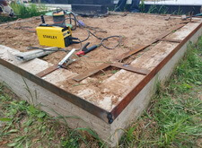Для начала мы крепим к периметру цоколя металлическую планку, которая послужит бортом для брусчатки. Для придания необходимой жёсткости навариваем на железо необходимые элементы, тем самым надёжно закрепляя планку.